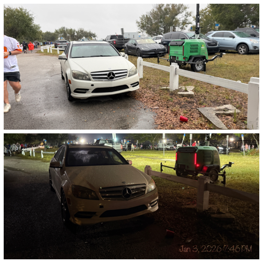 A white Mercedes-Benz was parked squarely on the pedestrian pathway outside the lot. It was there when we arrived for the game—and still there when we left.