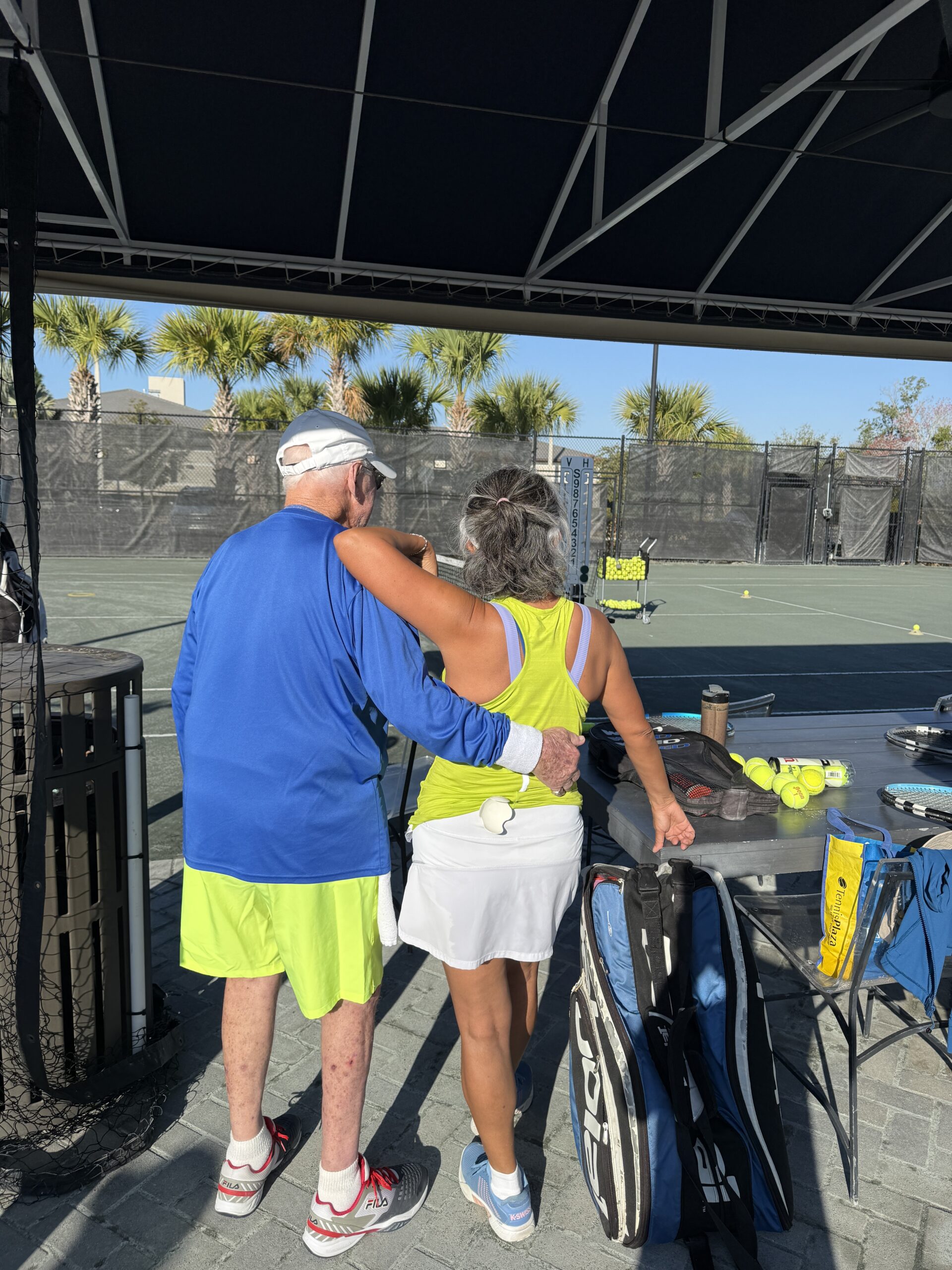 Tony and I (again) were leading, 3-0, then I lost my serve. It became a close game. I was serving 6-5, 40-30. We missed a few sitters in the game (quite a few in the set) and went to a tie-break. We lost two points right off the bat but were able to take back the tiebreaker, a point at a time. At 5-2, I called a deep baseline shot out, but Tony said it was good – a reversal. Eventually, we closed it out 7-3.