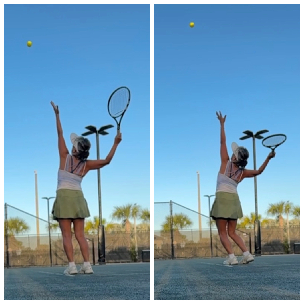 On serve, getting rid of waiter’s tray: throw the edge of the racket up to the ball OR throw the racket like a football.