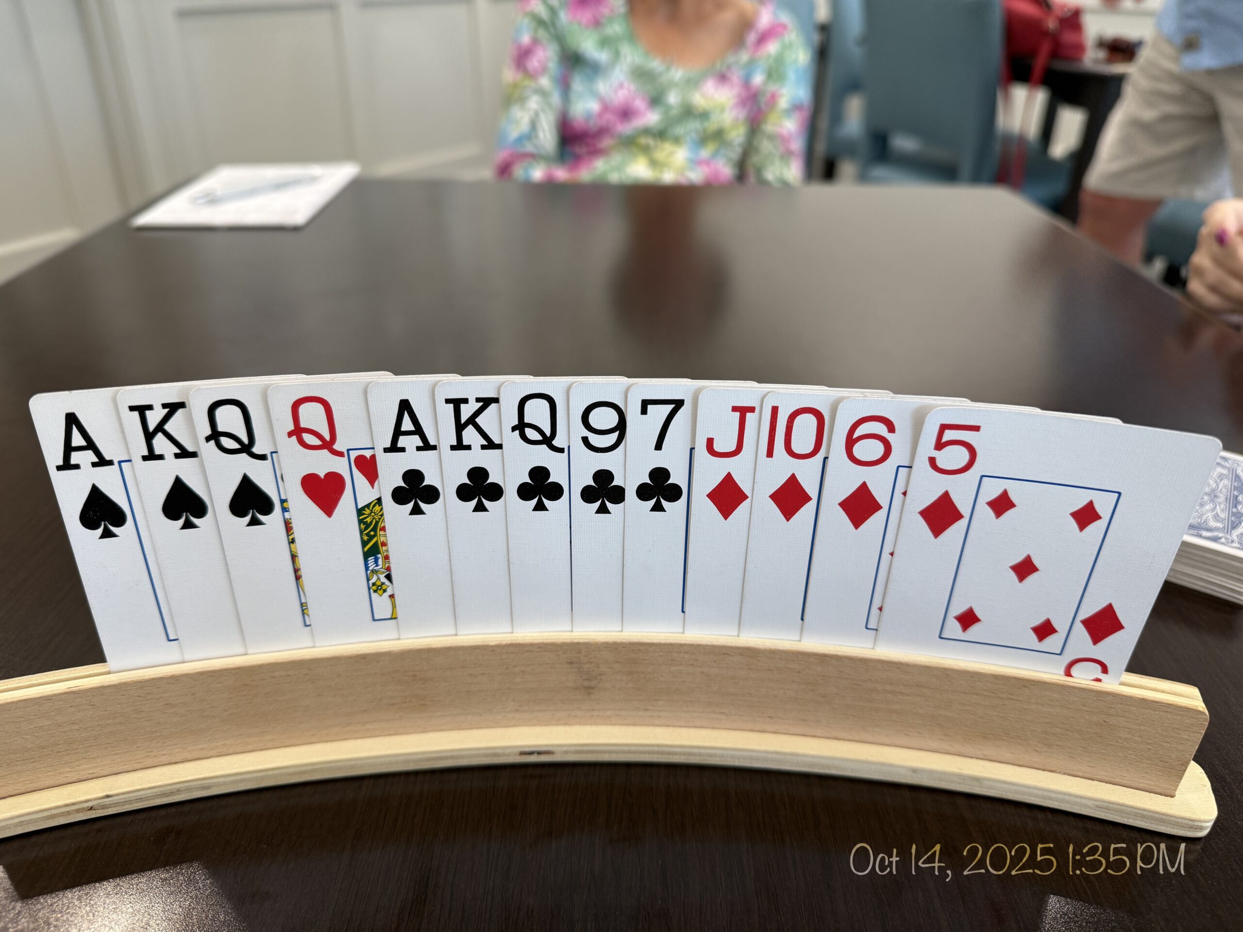 I bid 6 NT, and won a grand slam – all 13 tricks. It’s a wonderful 50 minuetes of play, before the book club.