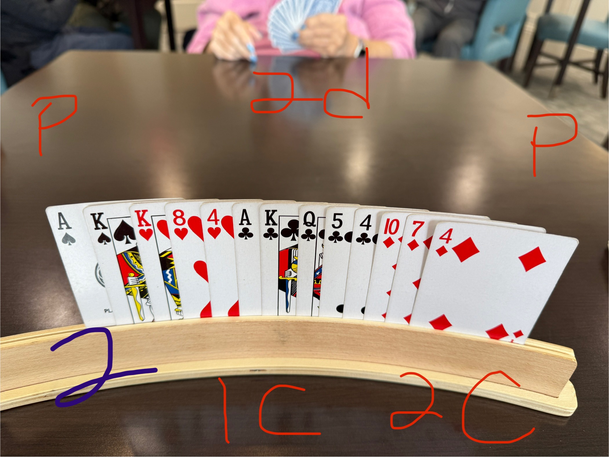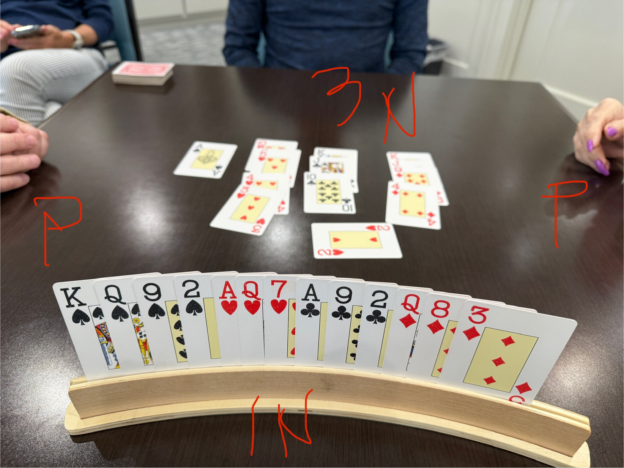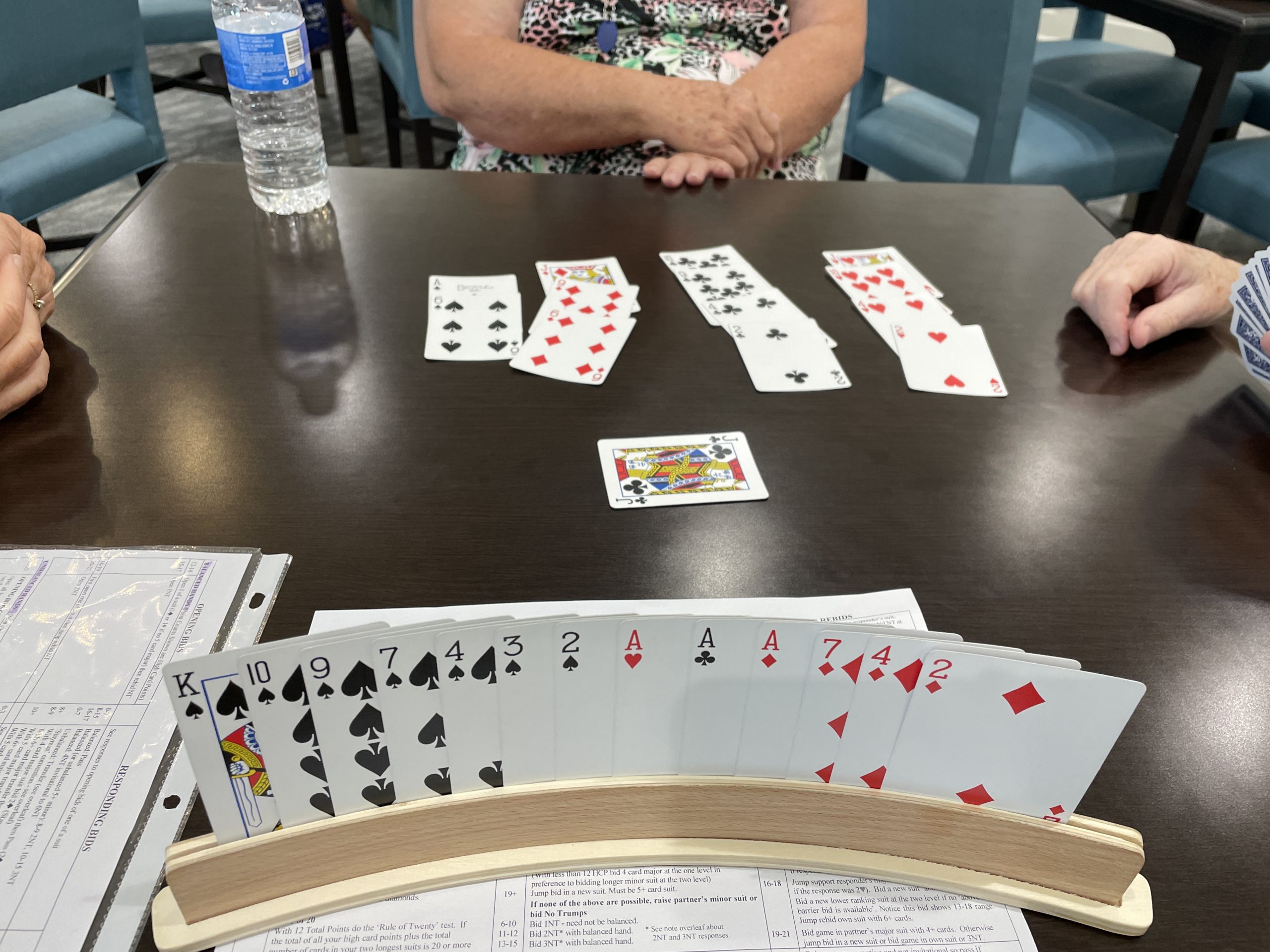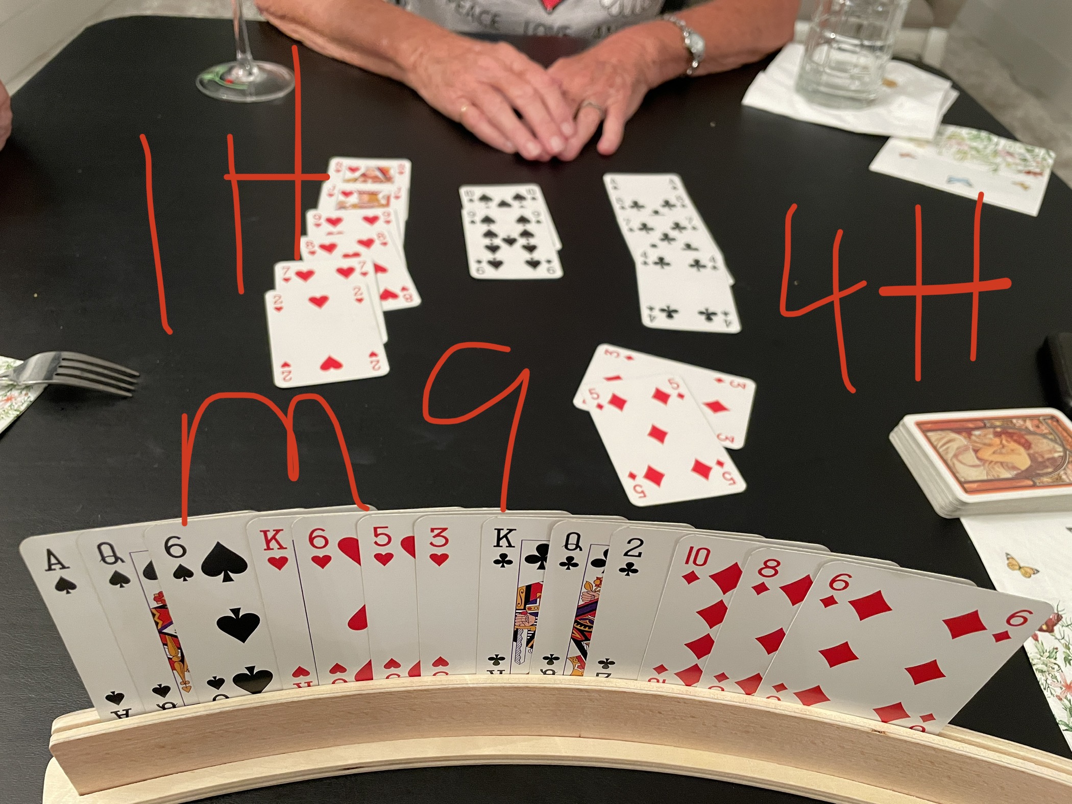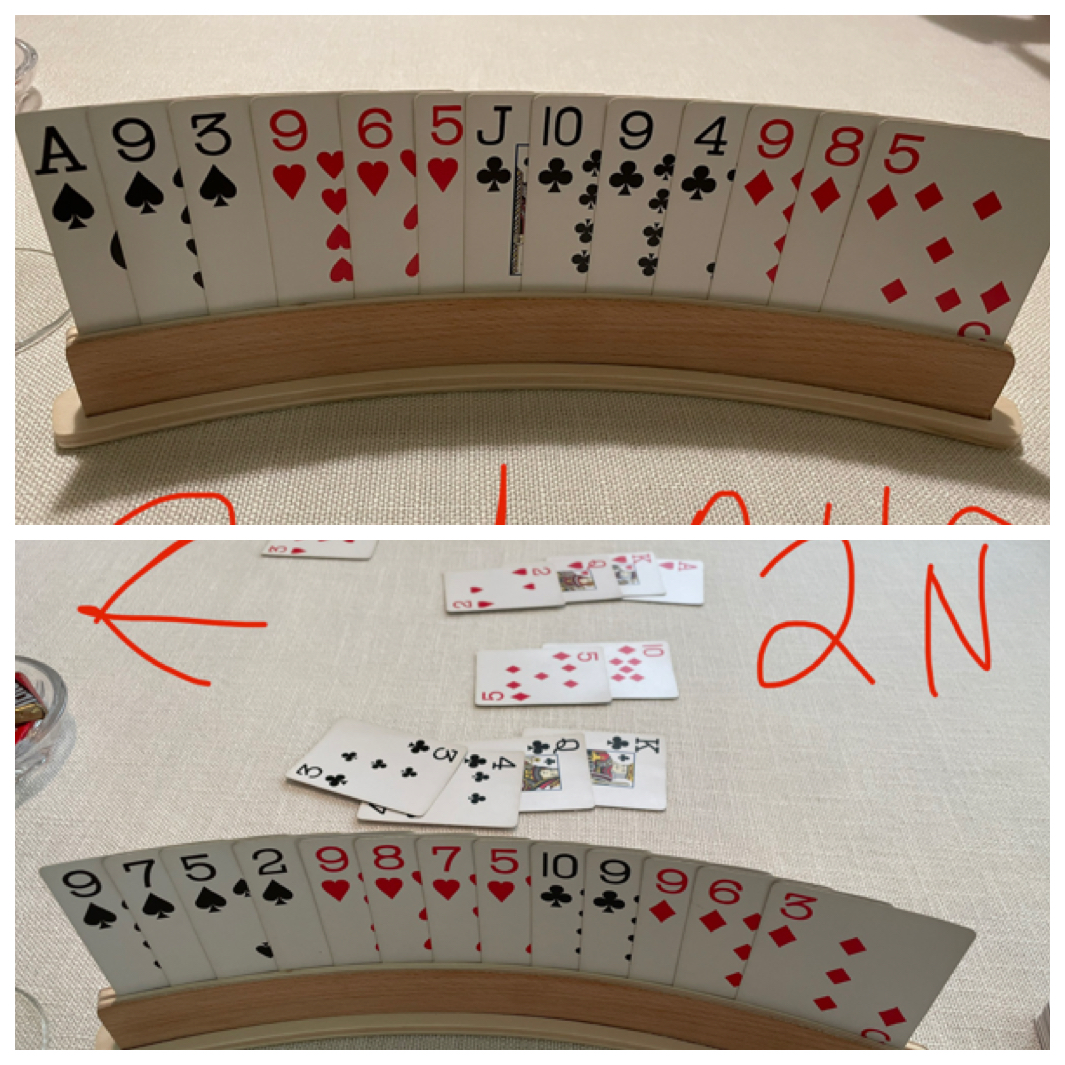 The 4♦️hand: I’ve 14 hcp and my P has 12, with a void of spade ♠️. I couldn’t remember what was the reason to land us in 4 diamonds, which I’ve 3 and P has 4. But her void of spade helped a lot.