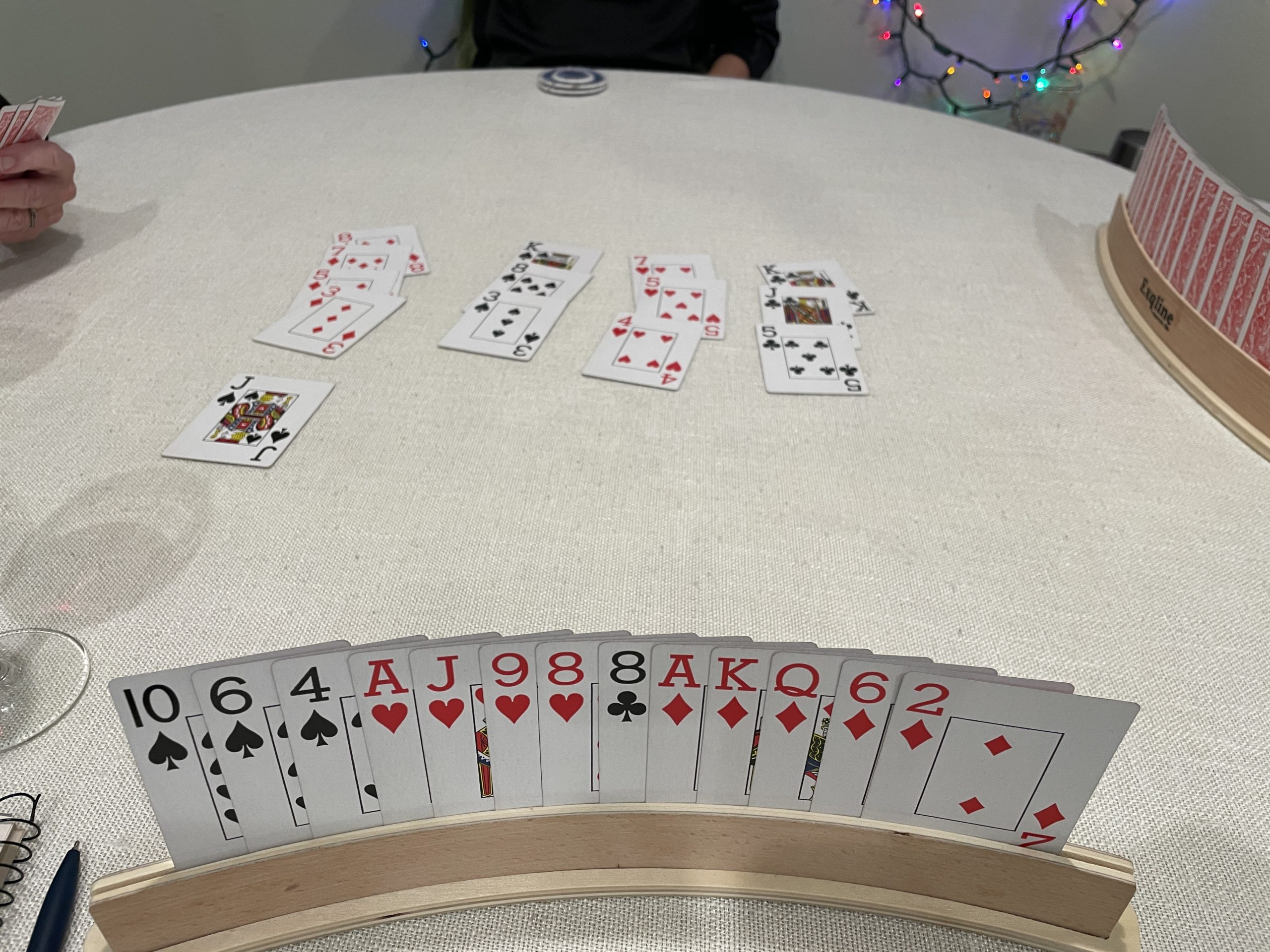 Tonight 18 hands were played, 5 were no trump. I played 7 hands, only won 1. A big fat Waterloo night.