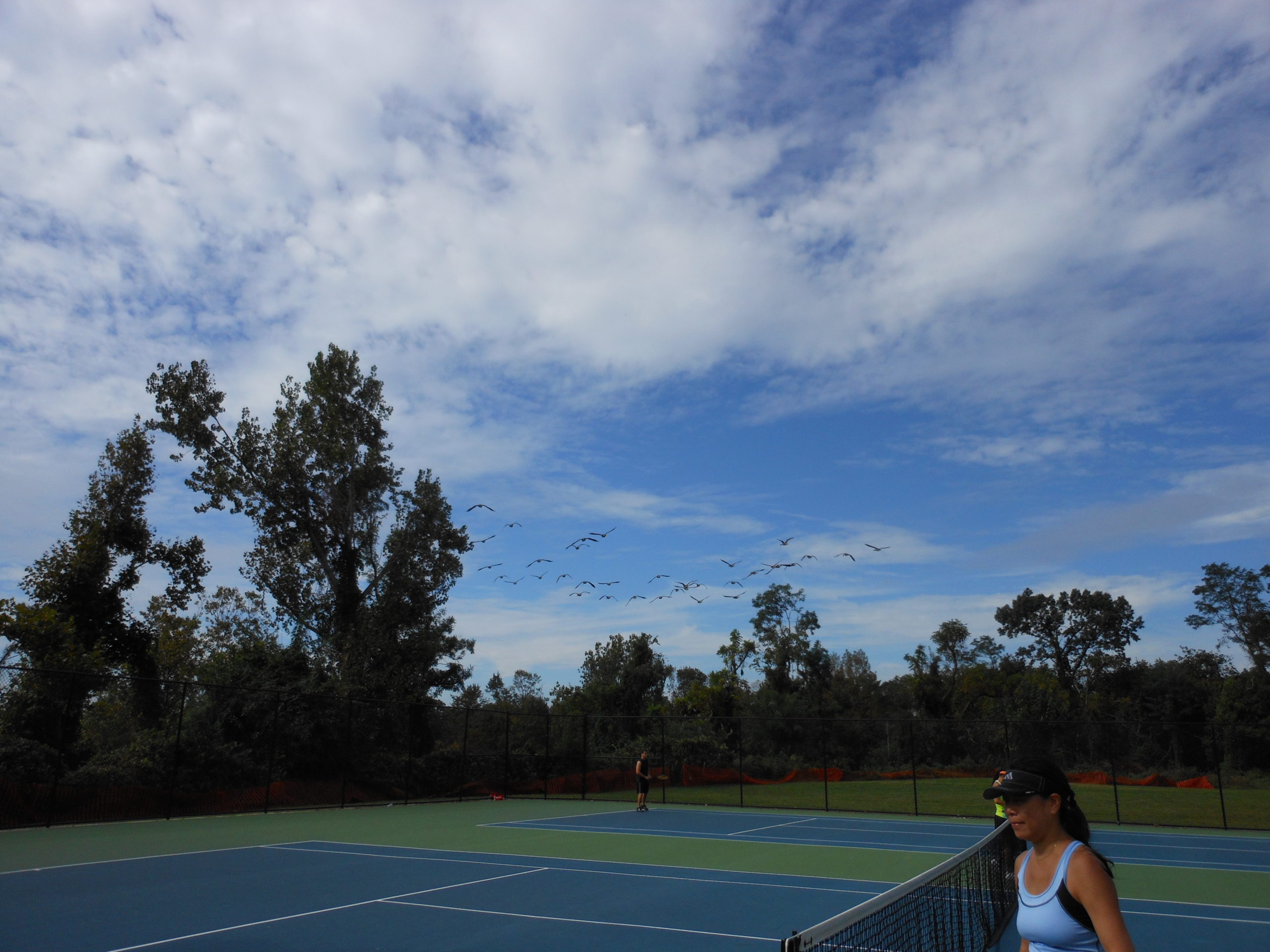 Ron teamed up with Wei beat Fisherman and I 6-3. Fisherman said he’ll be right back then hurried off the court to take care the usual business at home. The three of us went to the bleacher leaving the balls on the court, taking a break and watching our friends playing on the other side.