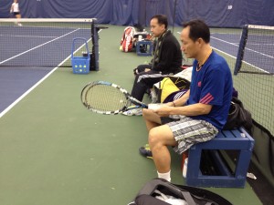 We exchange lineup a little early and leave for our own match at the main building. Court 12 is open for two hour straight but it’s kind of stuffy so we take court #6 8-9 and #1 9-10pm. Tony and I lost all sets: first set 1, the second set in tie break and the third set – I was beaten so soundly I couldn’t remember it any more -:).