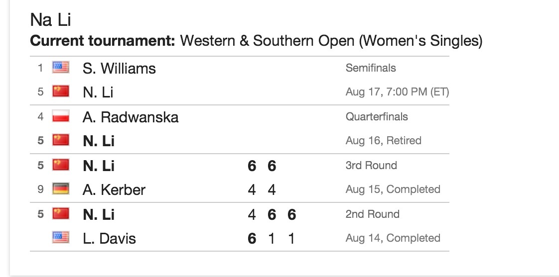 Serena stopped playing and called Li’s shot out. It was out, which gave Serena the game. It was 6:5 second set. Li Na would double faulted to give Serena her final at Cincinnati.