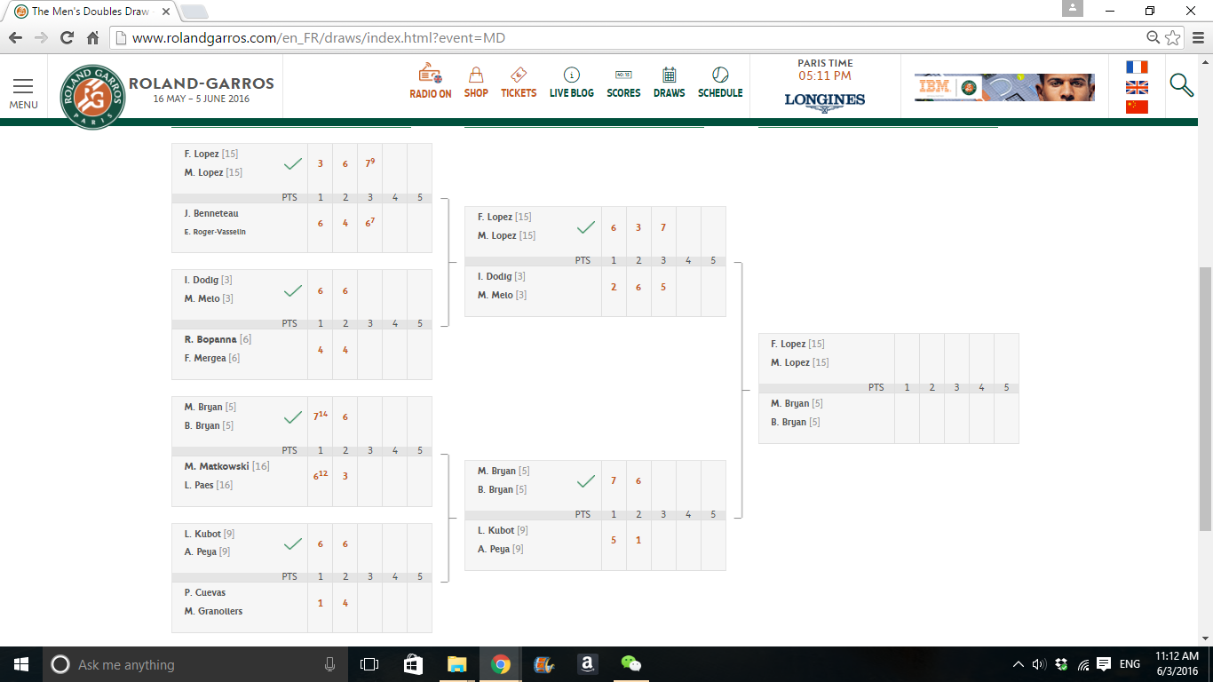 And the men’s doubles are F (Feliciano López) and M Lopez (Marc Lopez) vs Mike and Bob Bryan. Some fun coincident. Go twins!! Bring home the win.
