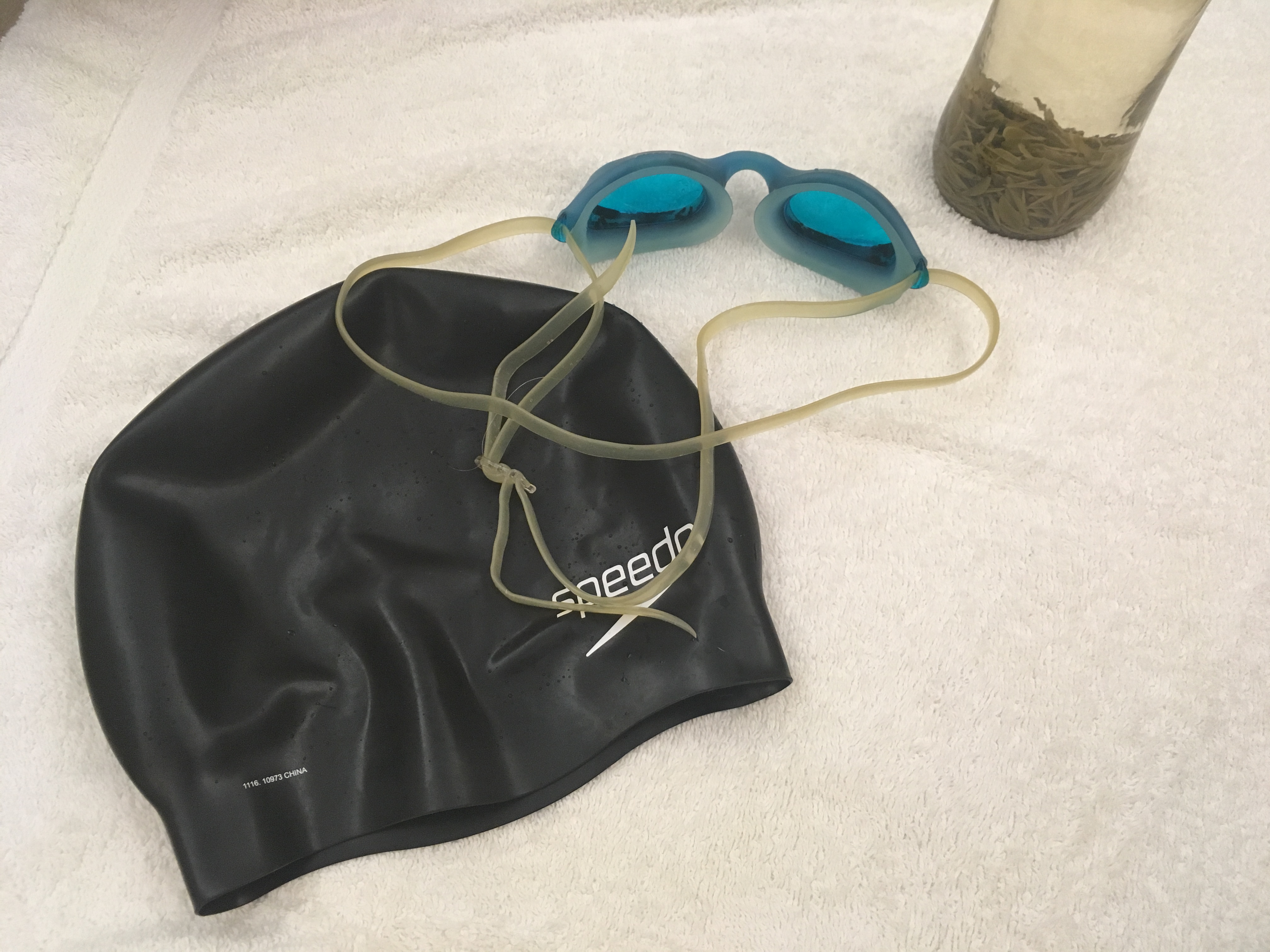 My little bathing cap, goggles and bottle of tea are the witness -:).