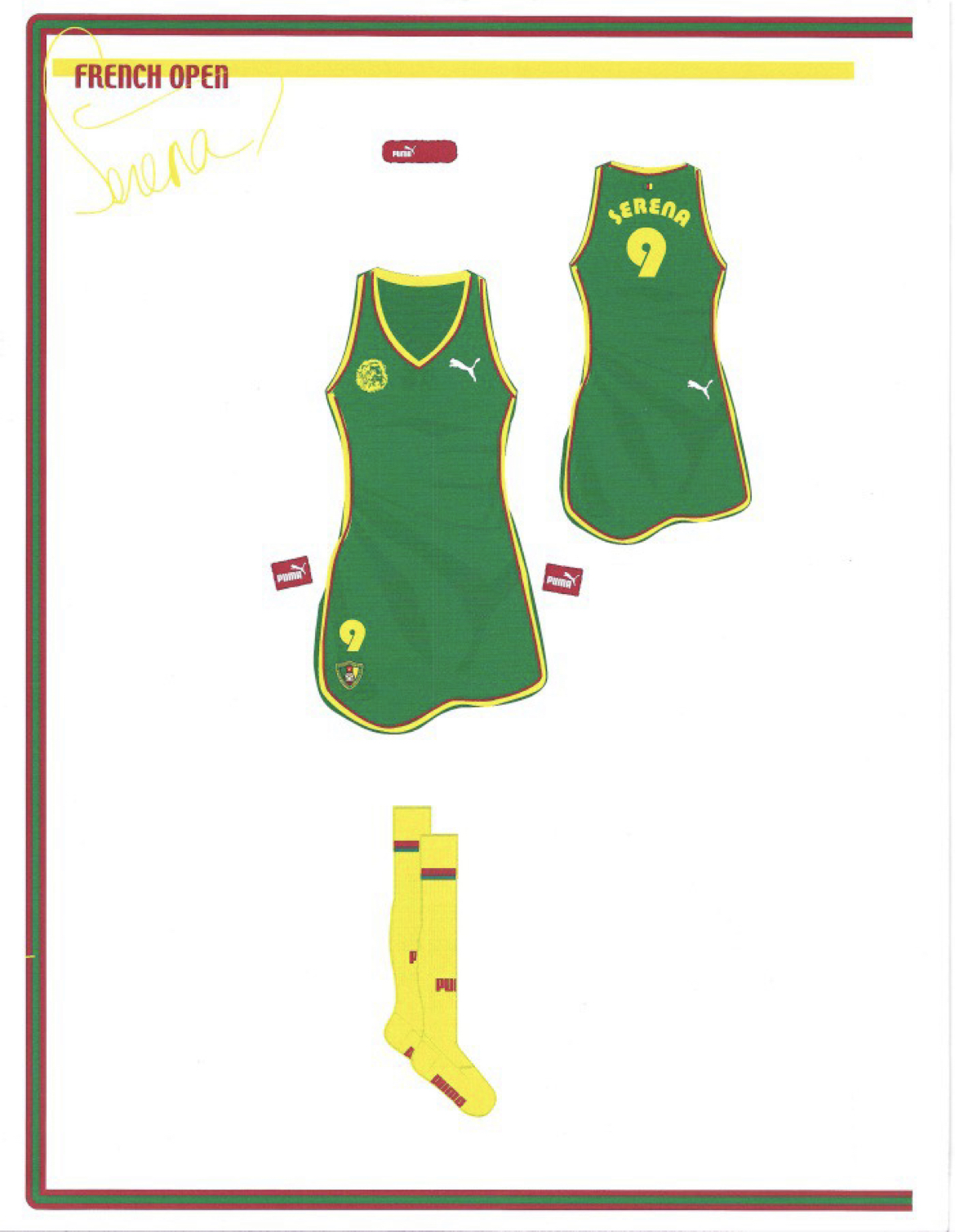 Puma truly flipped the script of traditional tennis attire at the French Open in 2002. The tournament was held during the first two weeks of the FIFA World Cup in South Korea. The marketing team at the brand, which also sponsored Cameroon’s national men’s soccer team, came up with the crazy concept of outfitting Williams in a dress resembling the kit the African nation would wear at the World Cup. Dominguez sketched a sample and pitched it to Williams, who loved the idea. In her opening match at the French Open, she took the court in Cameroon-themed apparel, down to a pair of yellow soccer socks pulled up to her knees.