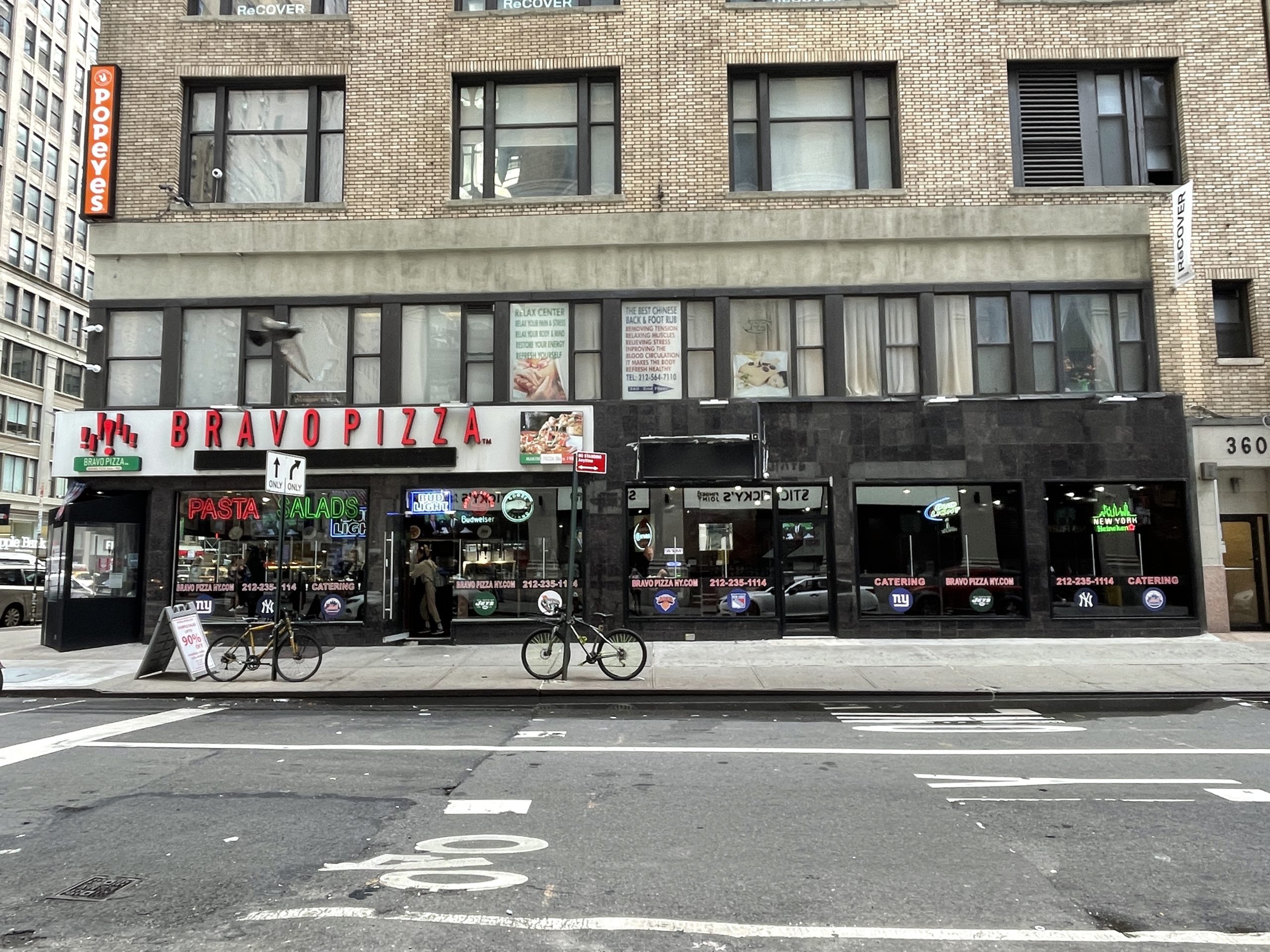 Sport bars is a major scene of New York, or any big city. This Bravo Pizza (360 7th Avenue @ 30th St.) displays almost all the logos of New York teams but Islanders. I know it’s Rangers’ territory but …
