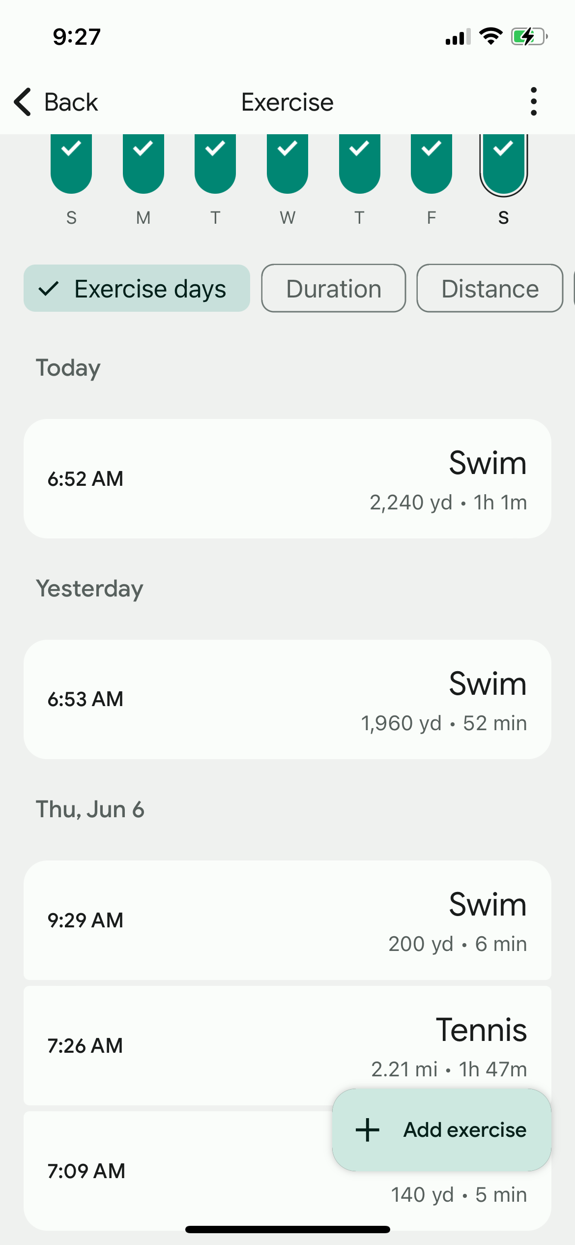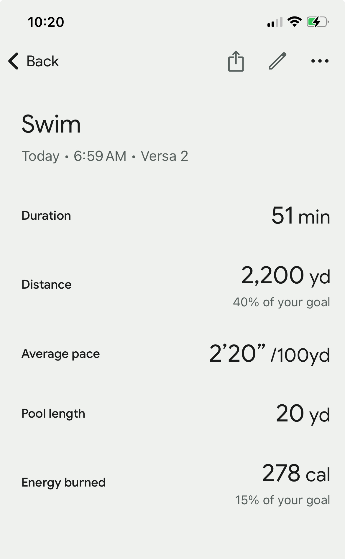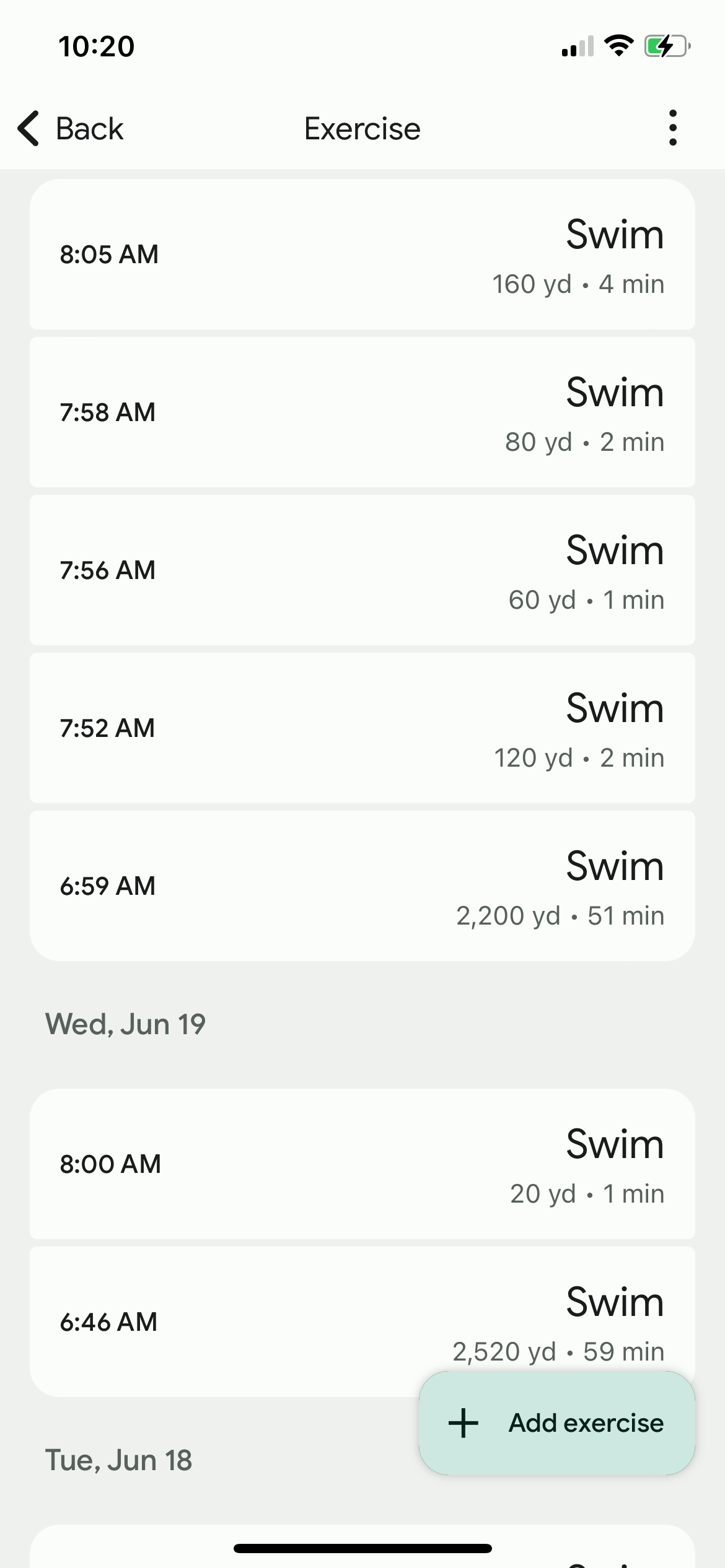 The bulk 2,200 yd is done in 51 minutes (total 2,620 in an hour). The water temp is 82° (better than 85 or 86 … lol).