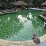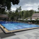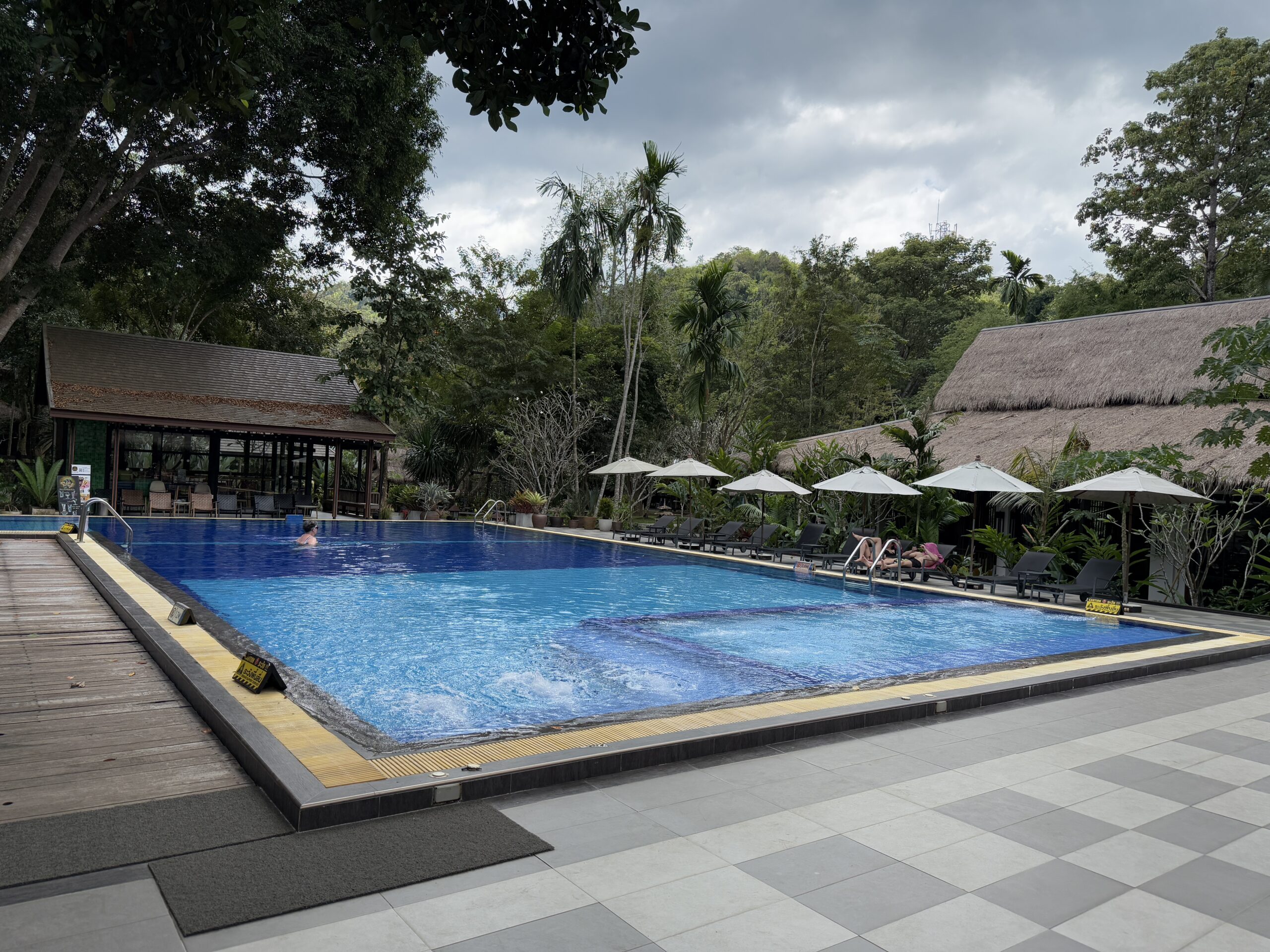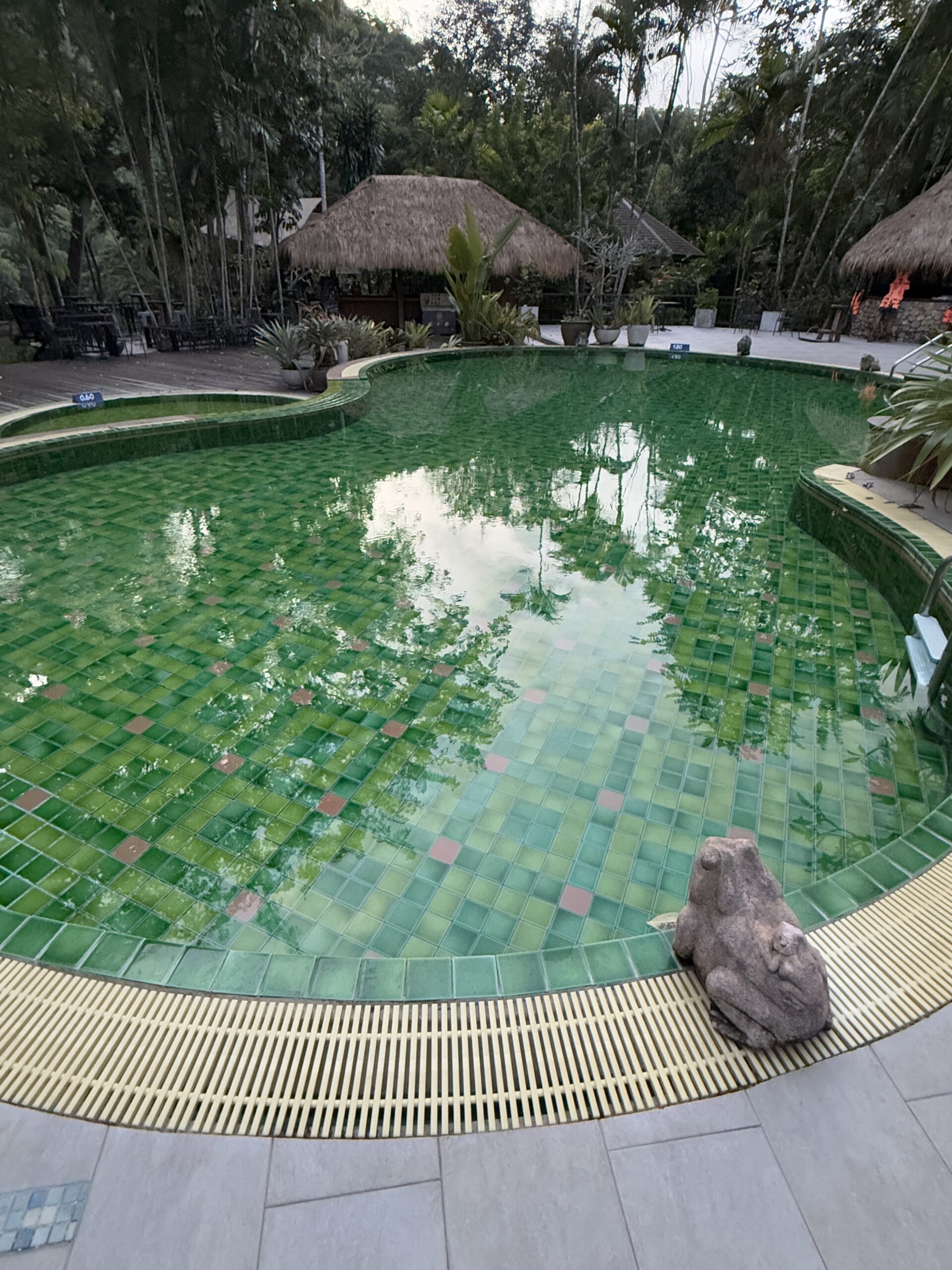 River Kwai Resotel in Thailand has two pools and many spots for yoga. The free shaped greenish pool by the restaurant is good lounging and a regtangle blue at the back of the resort is large enough to do laps.