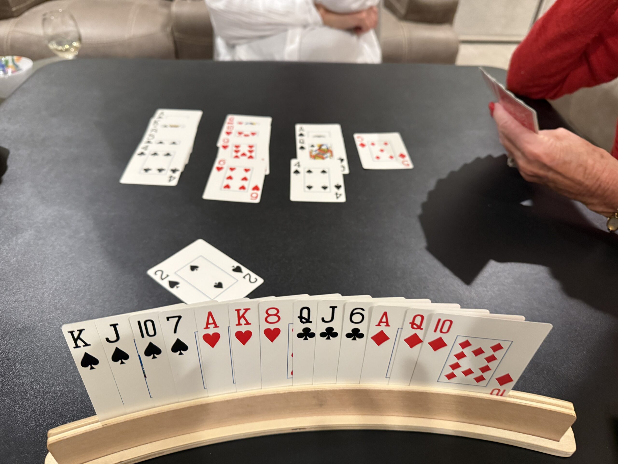 We played a total of 21 hands, with the same partner (Barb and I, v Joyce/Matt). Barb played 12, winning 6, and I played 5, and won 5. Host Matt played 1 and lost pretty badly.