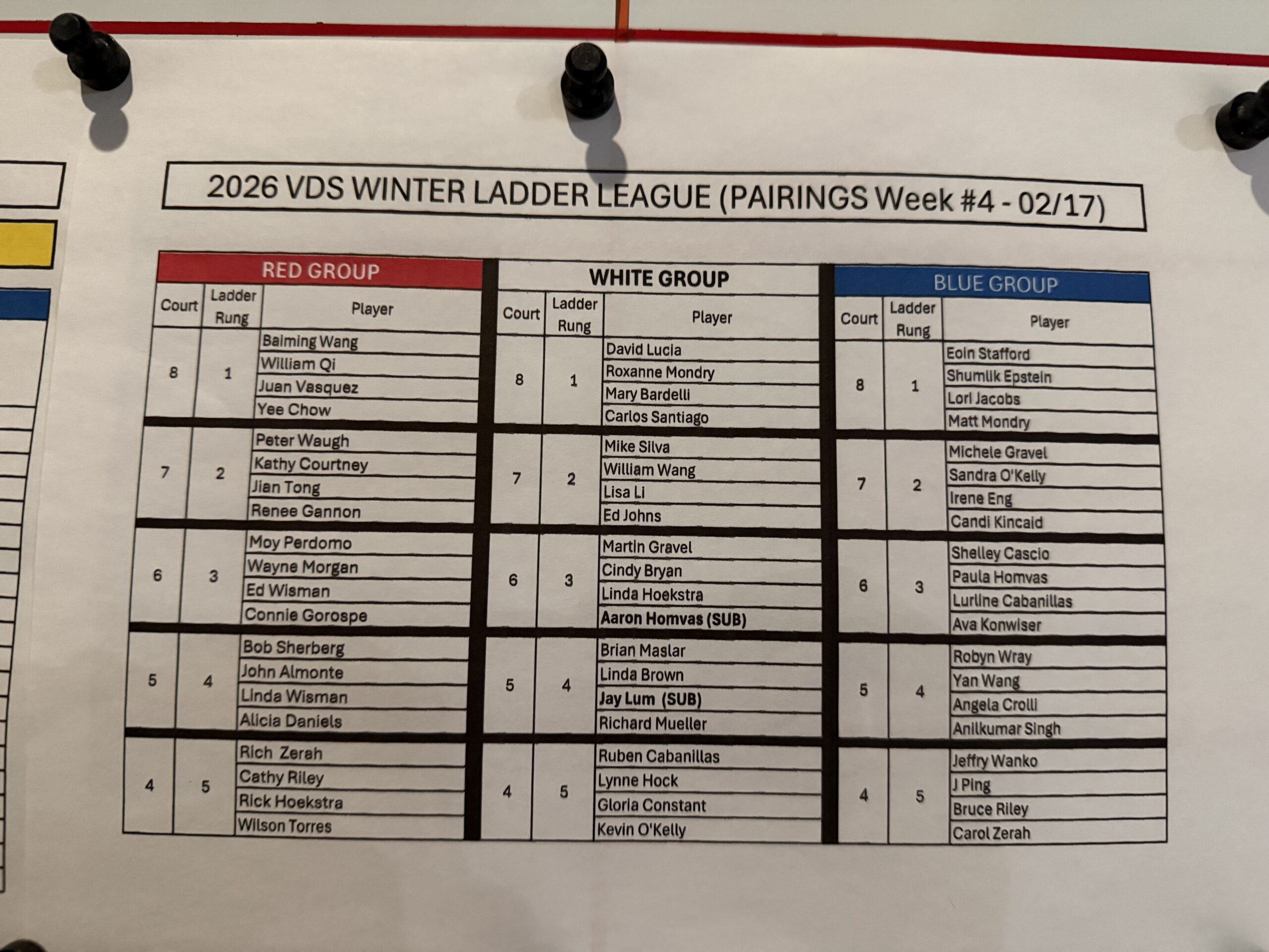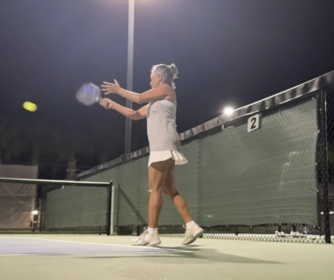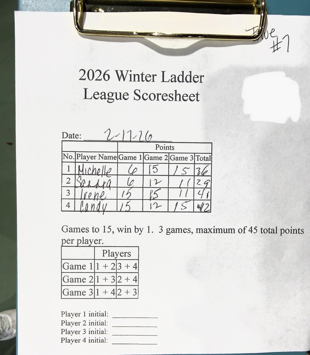 Week 4 of the Ladder League pickleball: I won two sets, with 41 points, came in second in the group (Candi has 42 pts). We played on Court #7: