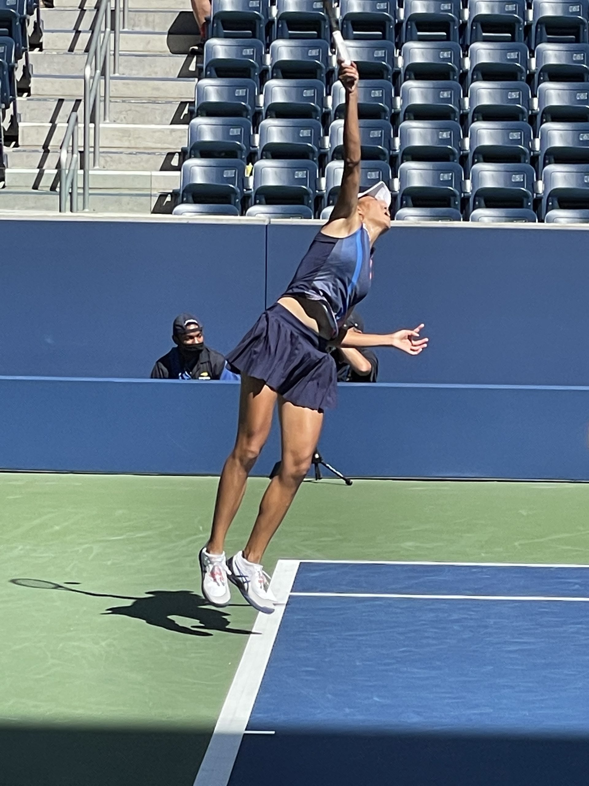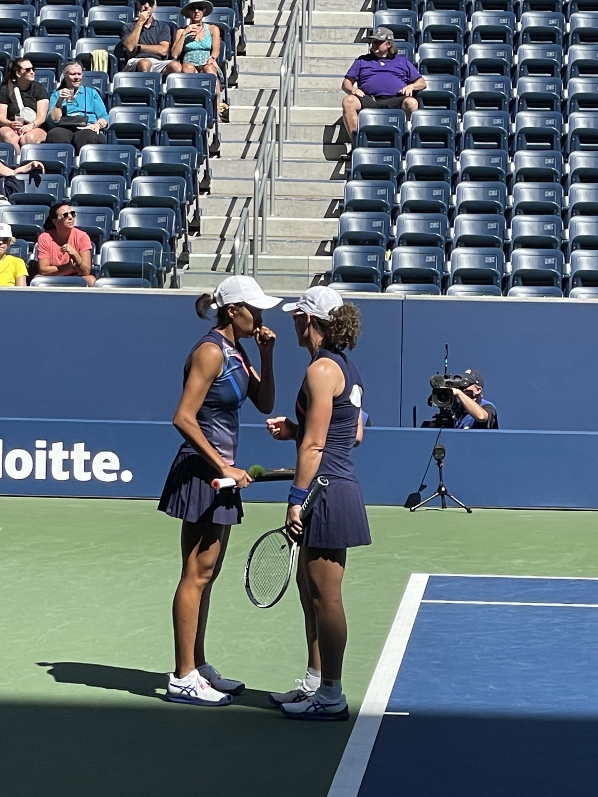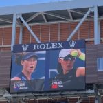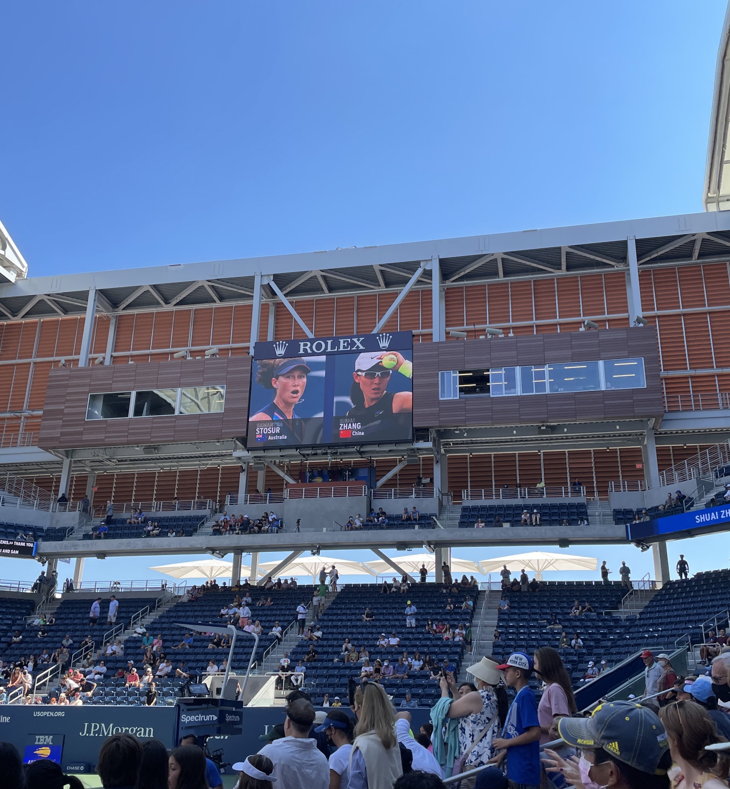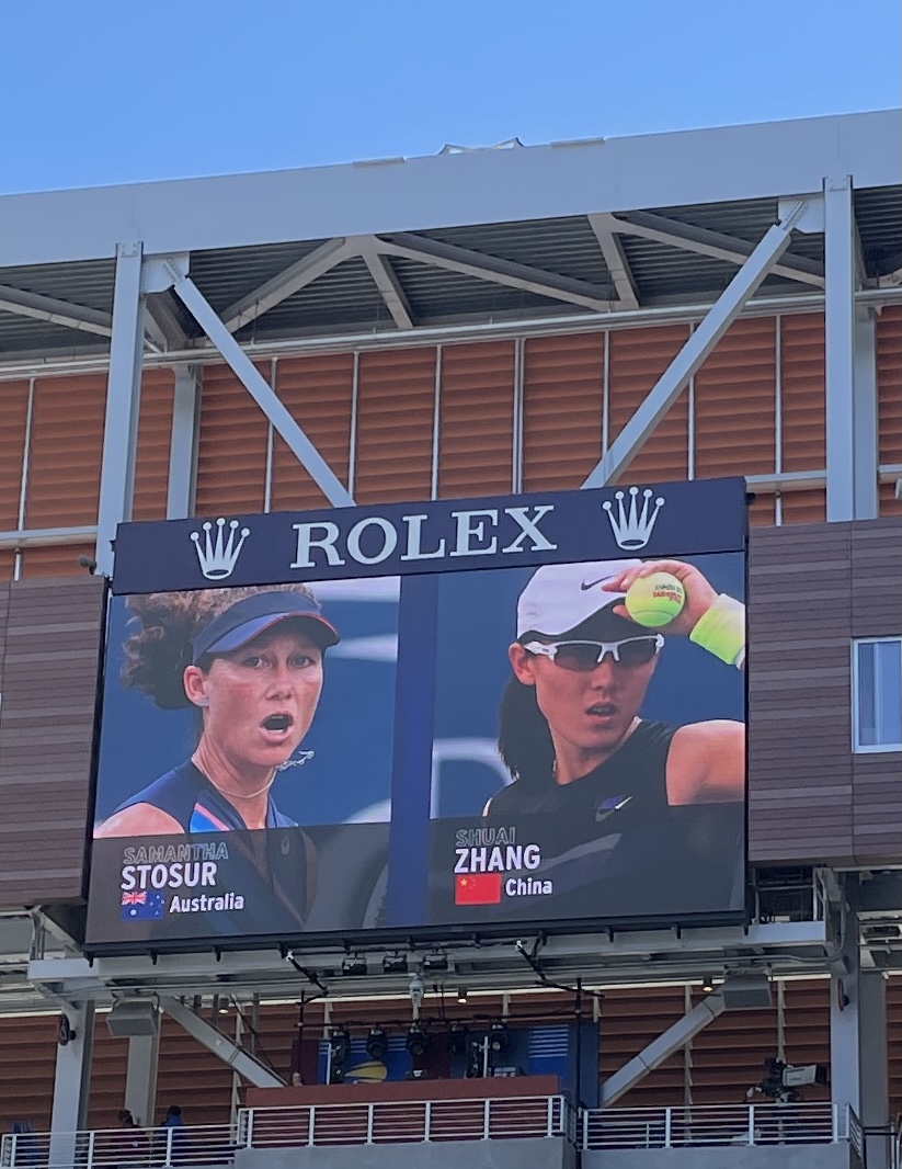 The second match at Louis Armstrong stadium is women’s doubles which is our main attraction: Zhang Shuai and Sam Stosur. There are a few interruptions from system malfunction (?) and the biggest one is, USTA put up (郑赛赛 1994-) Zheng Saisai’s photo for Zhang. This is a bit too hard to swallow.