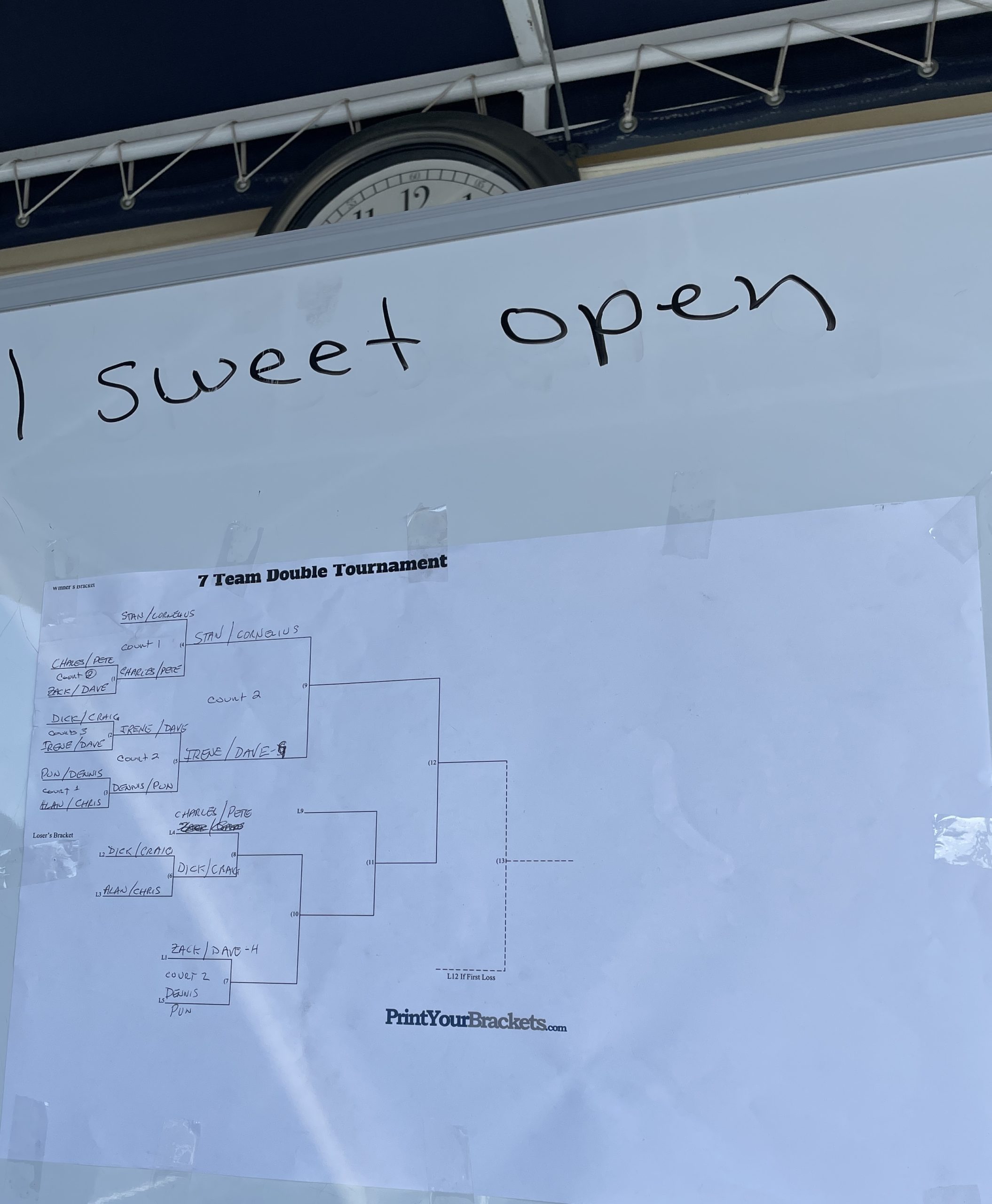 The Sweet Open (coach initially wrote sweat 😓… One letter different but actually both are good) is our first tennis tournament for the community. 13 men and two women players showed up. The coach has to step in to make the 8th team. We drew our partner from a hat 🎩.