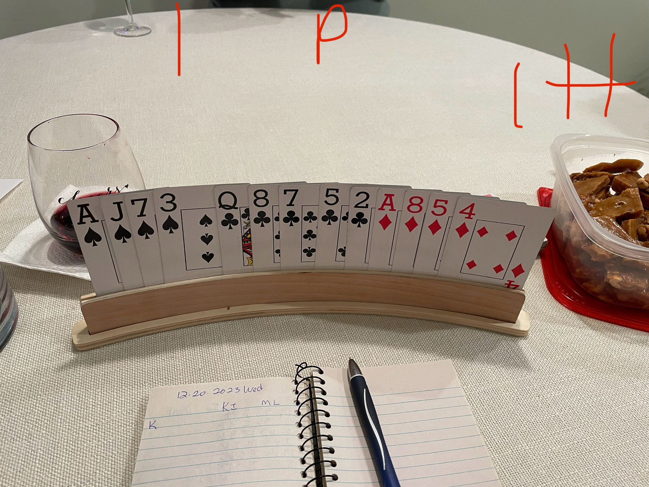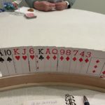 The 3rd hand: after playing the previous two hands, I wasn’t going to bid again. But got this good looking hand: 17 hcp, 7 card suit, 1 singleton and 1 doubleton. The bid: