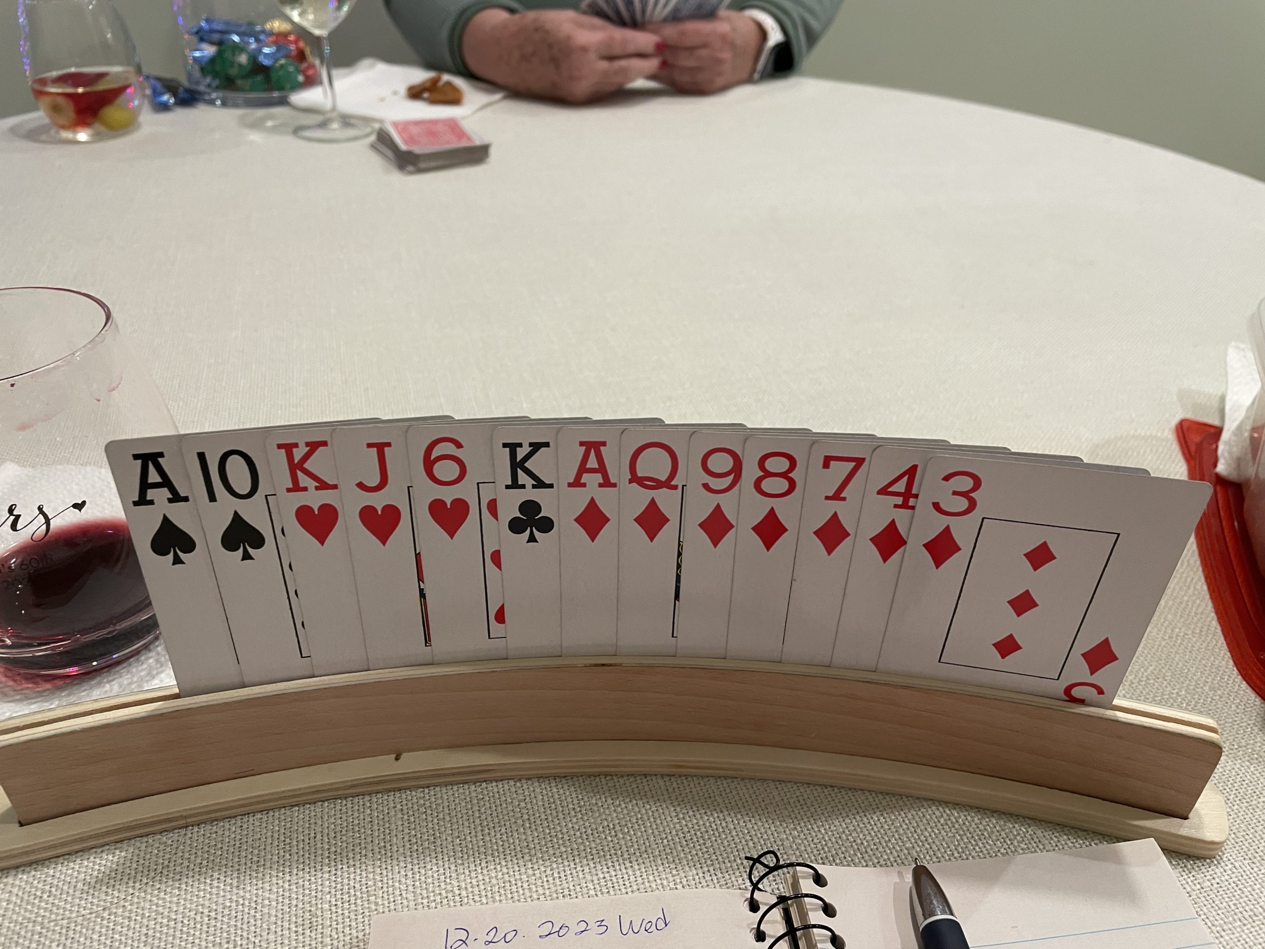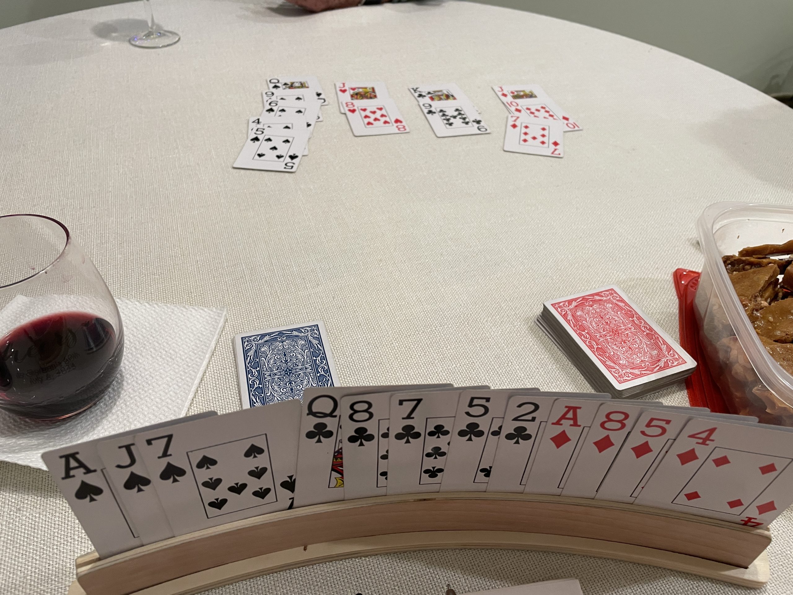 Girls night in, I played the most hands, to a point I felt a little guilty. 8 hands each with two different partners, I played 3 each, total six hands.