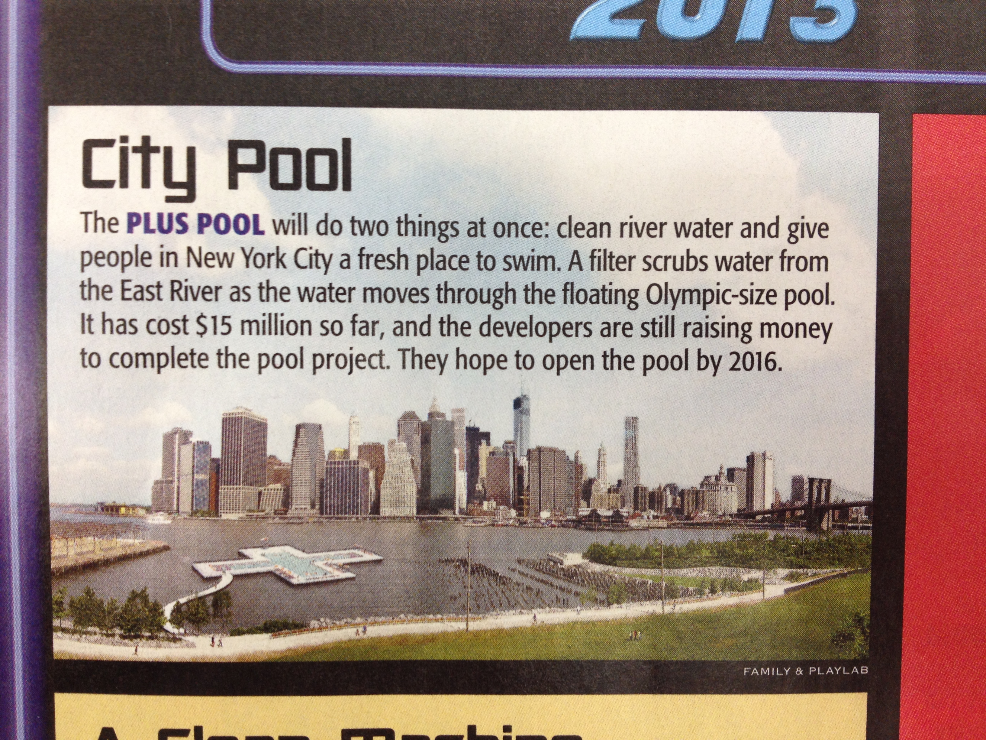 In the East River in New York City. This floating Olympus-size swimming pool is still in the funding stage, and hope to open in 2016